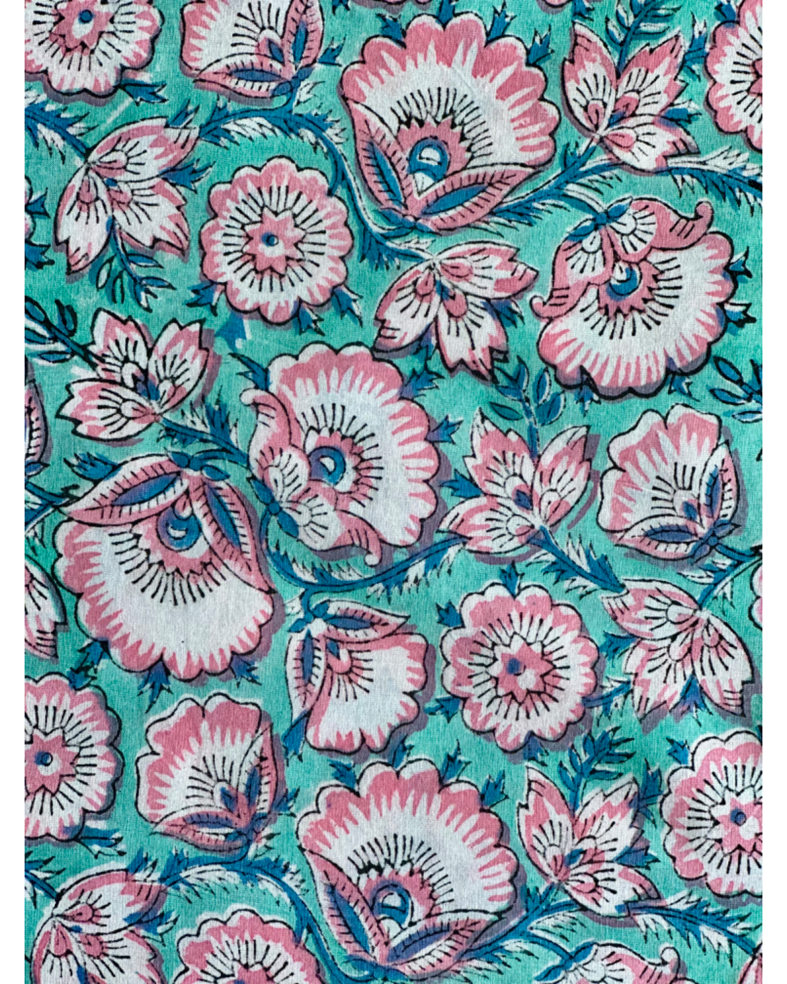 Handcrafted in Jaipur using centuries-old block printing techniques, this 100% cotton fabric features delicate aqua florals on a soft ivory base — perfect for lightweight dresses, tops, skirts, home décor, and craft projects.