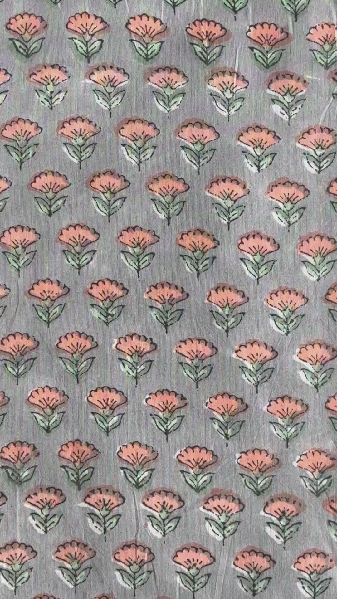 The sophisticated color palette sets this fabric apart. Warm apricot-peach flowers with soft green leaves are beautifully defined with a fine, dark outline, all set against a calming, cool-toned grey background.