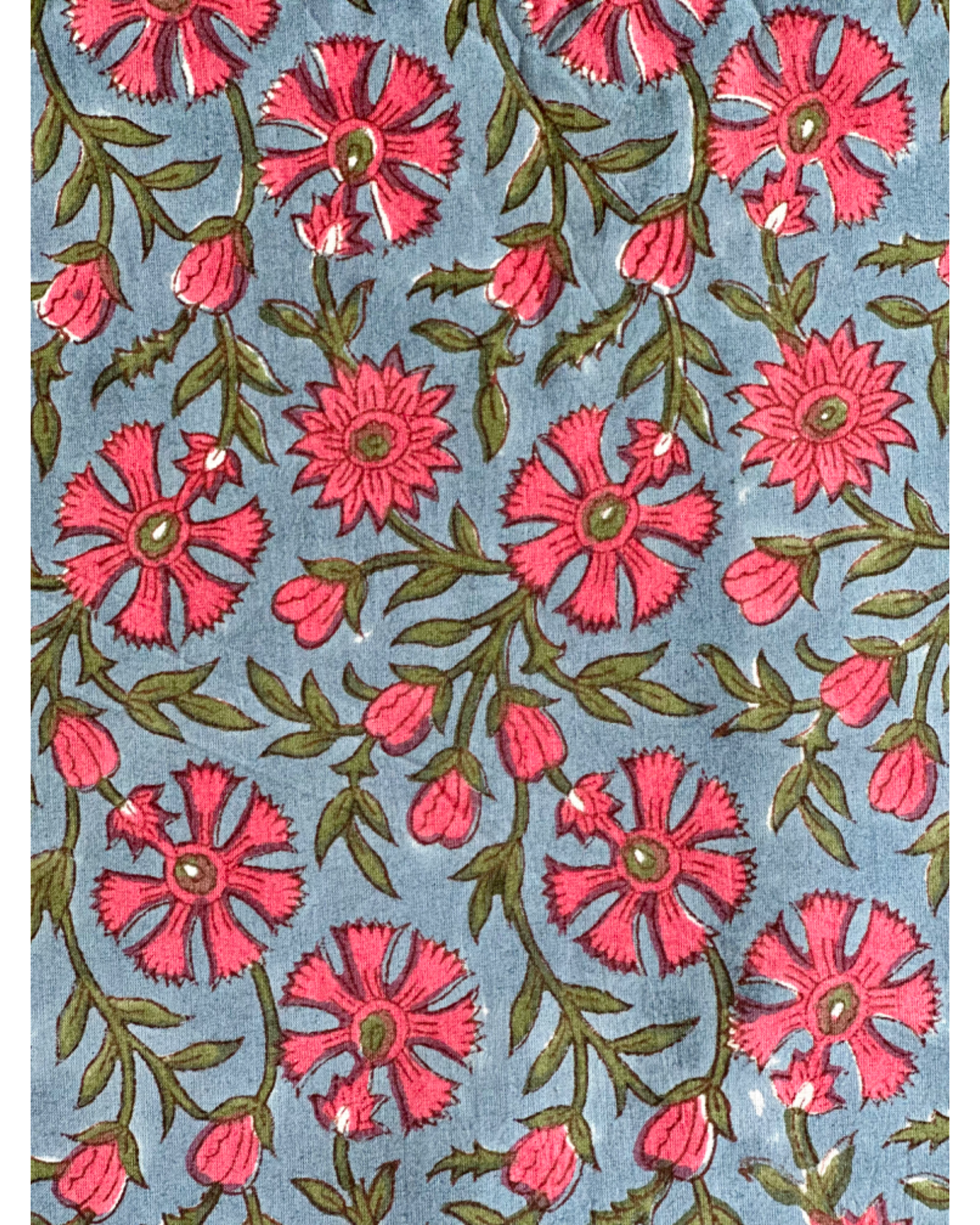 Capture the essence of a vibrant summer garden with our Fuchsia Hand Block Print Fabric. This exquisite textile features a lively all over cheerful pink flowers and lush green foliage, set against a soothing grey background. What makes this fabric truly special is the inclusion of a beautifully designed coordinating border print. This thoughtful detail allows for endless creative possibilities in your designs.