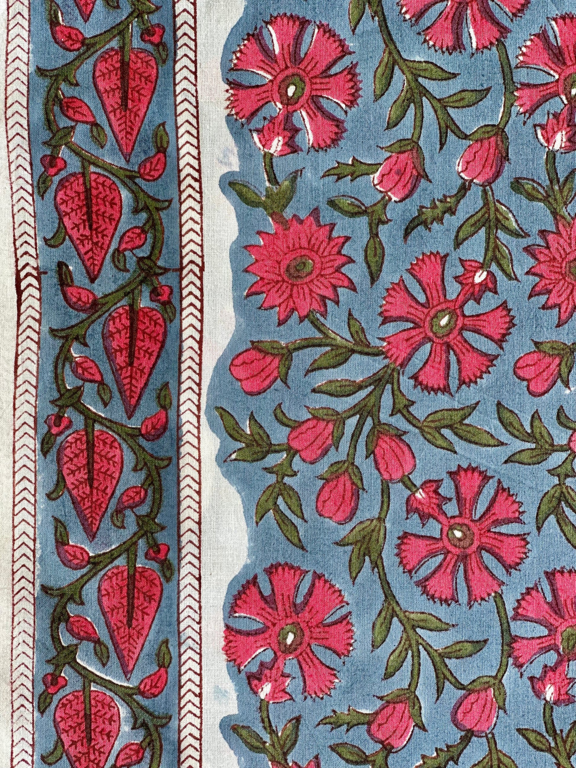 Each element, from the main floral field to the intricate border, is meticulously hand-blocked by skilled artisans in India. This traditional process ensures unique character and an authentic artisanal feel. Crafted from 100% premium cotton, the fabric is wonderfully soft, breathable, and drapes beautifully, making it a joy to work with.